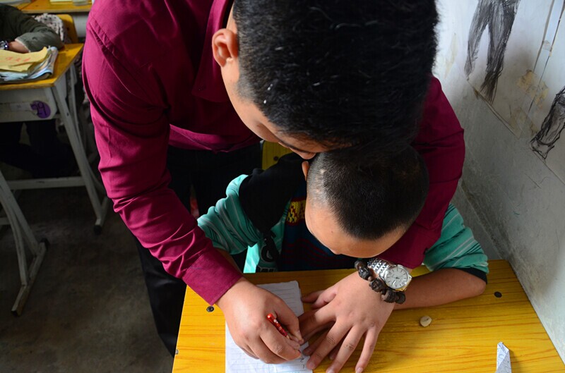 在和這些孩子們的接觸過程中,我們發(fā)現(xiàn),雖然他們的生活條件不是太好,自身或多或少的有些殘疾,但這些孩子并沒有我們之前所想象的那樣孤僻,反而是個個面帶著燦爛的笑臉,保持著積極樂觀的生活態(tài)度。這些孩子中有的畫畫的很好,有的字寫的很漂亮,還有的孩子興高采烈地拉著我的手讓我給他照相……我們所有人都融入到這群孩子當(dāng)中,教給他們寫字,和他們一起玩耍、做游戲,而他們也教會了我們不管生活有多艱苦,都應(yīng)該報以一顆感恩的心去勇敢地面對生活。
