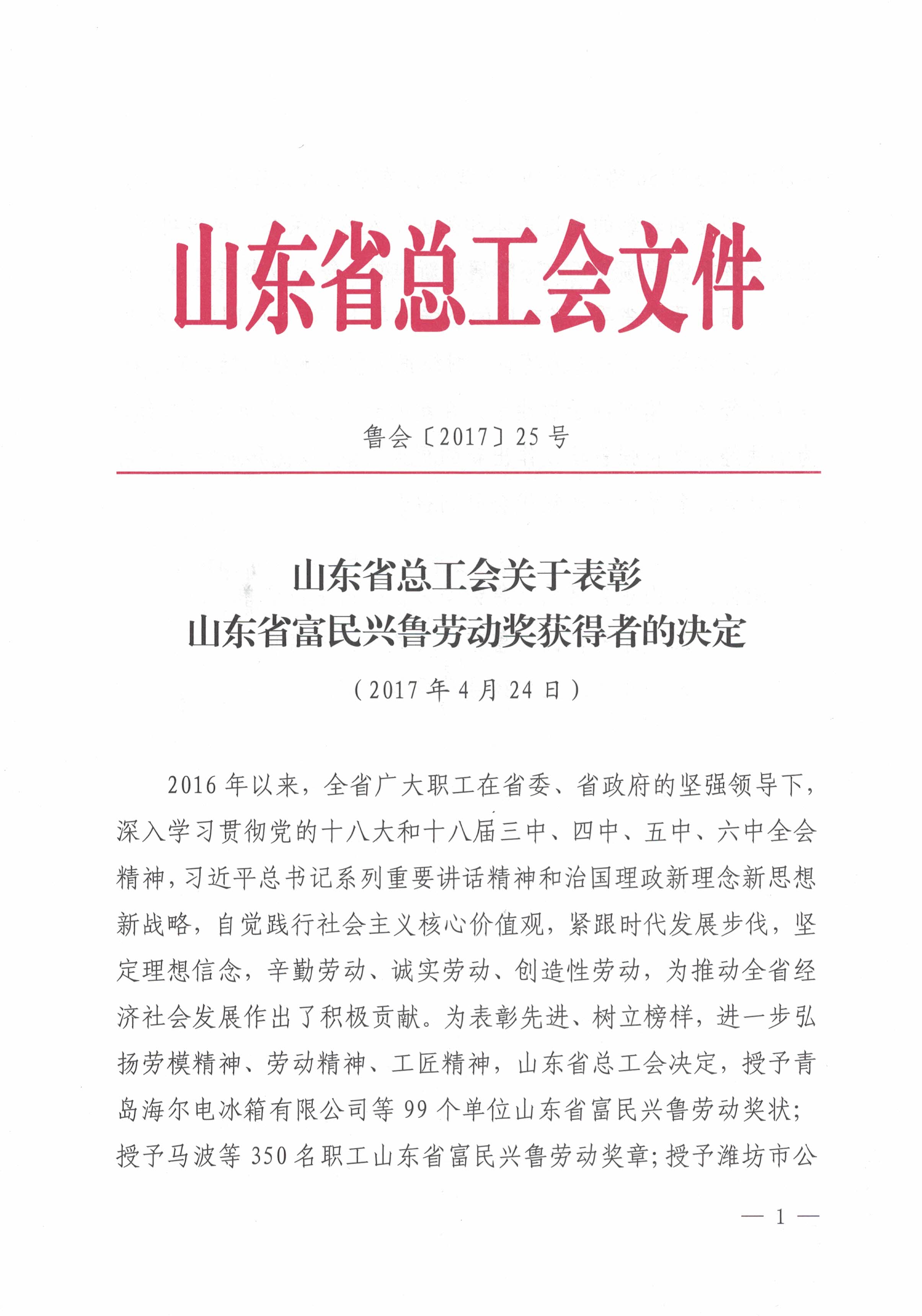 據(jù)了解,“富民興魯勞動獎狀”是山東省總工會組織評選的先進(jìn)集體獎項,旨在激發(fā)各單位自覺踐行社會主義核心價值觀,緊跟時代發(fā)展步伐,堅定理想信念,辛勤勞動、誠實勞動、創(chuàng)造性勞動,為推動全省經(jīng)濟(jì)社會發(fā)展作出積極貢獻(xiàn),最終為實現(xiàn)“十三五”規(guī)劃目標(biāo)任務(wù)和全面建成小康社會建功立業(yè)。