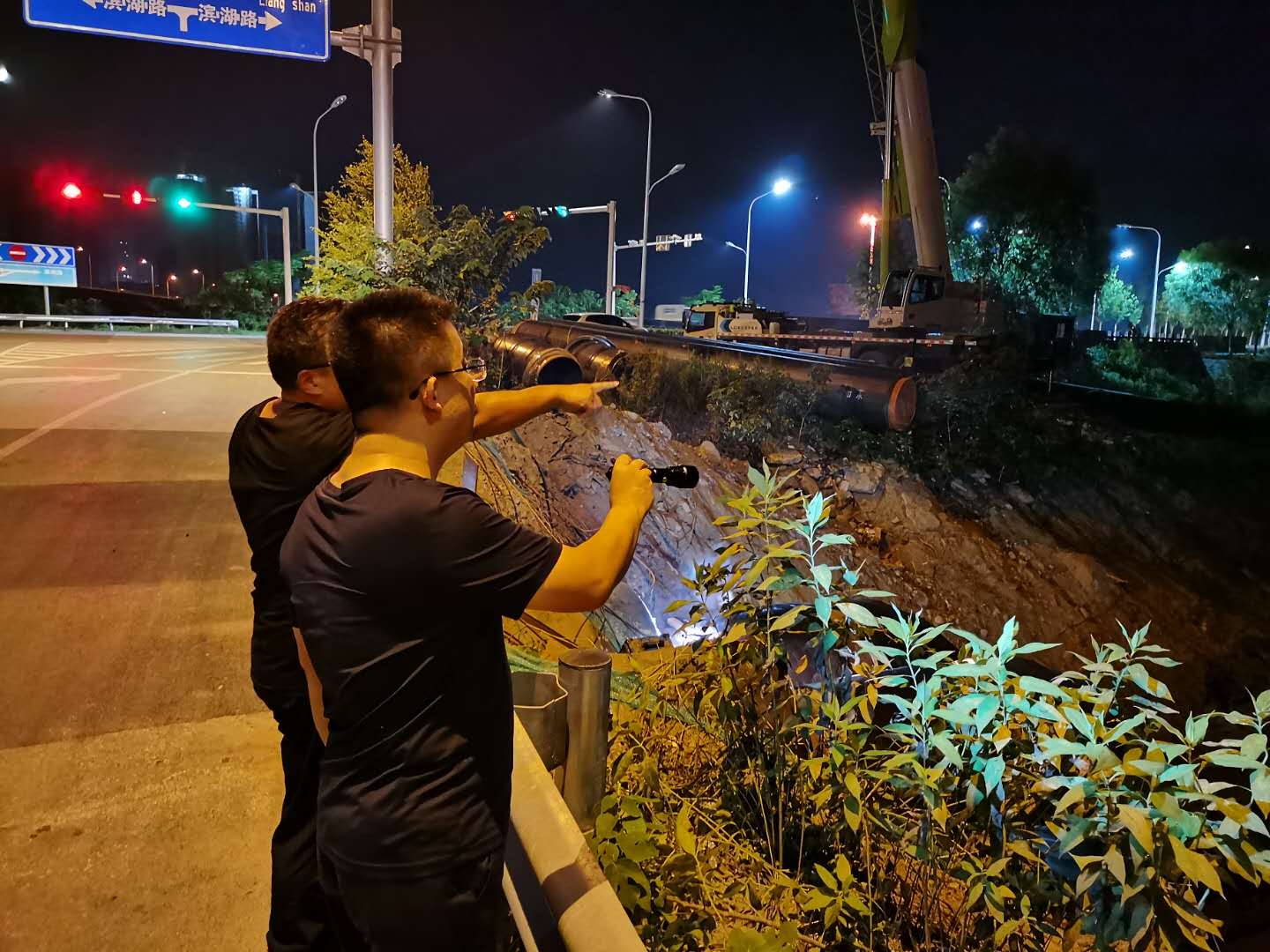 鄧剛先后視察了管網(wǎng)施工第六標(biāo)段、頂管過地表水超采、頂管過火頭灣大橋、頂管過S321公路等5處頂管施工現(xiàn)場。時至23:40分,在頂管過南躍進溝工作井施工現(xiàn)場,數(shù)名施工人員挑燈夜戰(zhàn),正進行頂管軌道焊接安裝和設(shè)備調(diào)試工作,夜燈下的身影在工地上來往奔波,現(xiàn)場到處是搶抓工期的干勁與熱情。