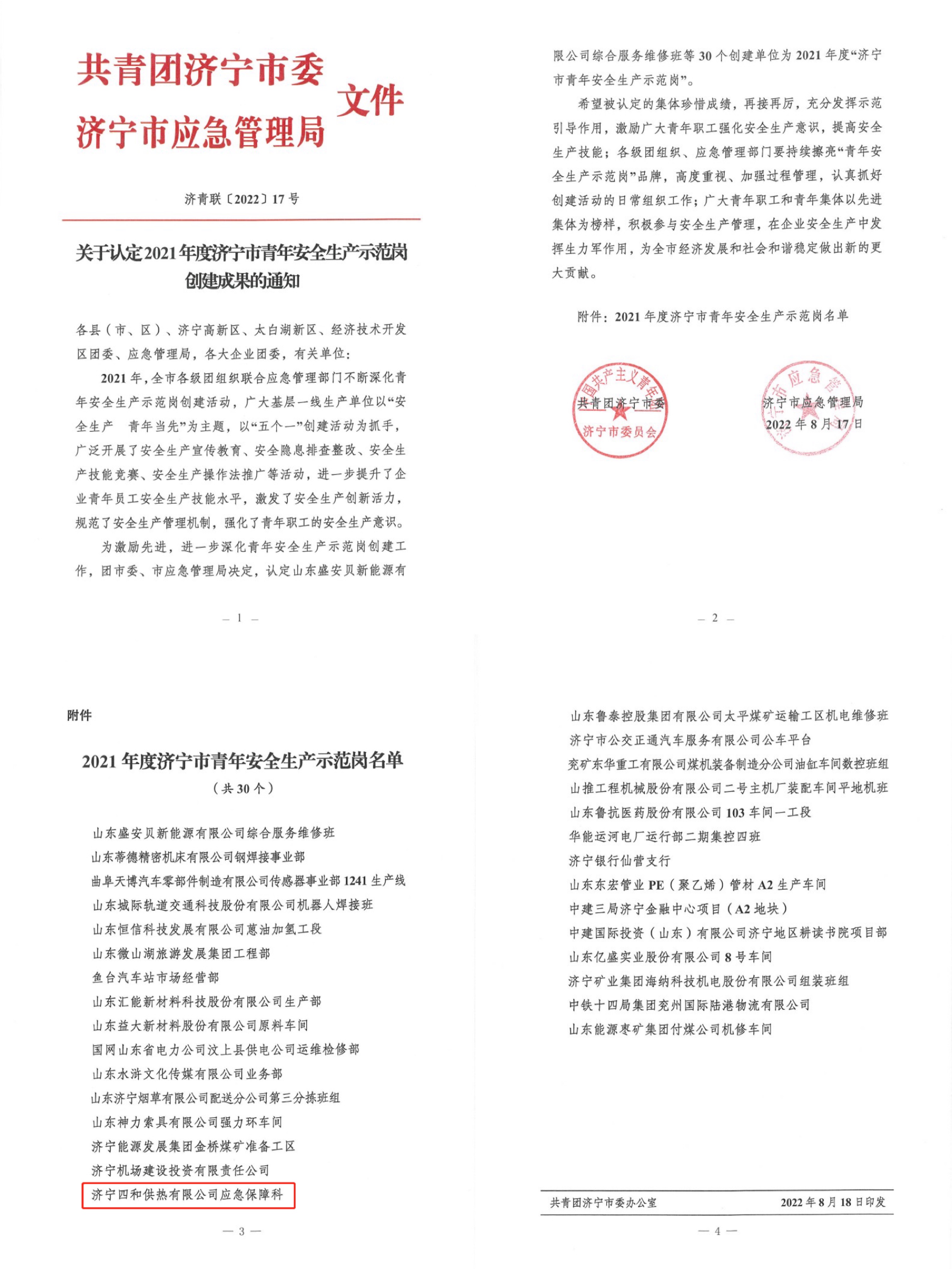 近日,共青團(tuán)濟(jì)寧市委、濟(jì)寧市應(yīng)急管理局聯(lián)合下發(fā)了《關(guān)于認(rèn)定2021年度濟(jì)寧市青年安全生產(chǎn)示范崗創(chuàng)建成果的通知》,認(rèn)定濟(jì)寧四和供熱有限公司應(yīng)急保障科為2021年度“濟(jì)寧市青年安全生產(chǎn)示范崗”。