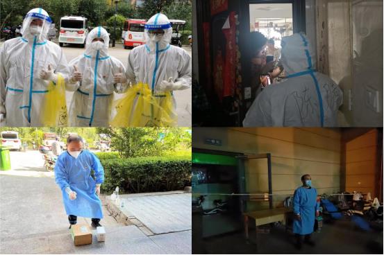 職工劉曉龍?jiān)诮鸪墙值琅J猩鐓^(qū)做防疫志愿者,維持社區(qū)秩序、分發(fā)物資,幫助協(xié)調(diào)解決居民生活需求