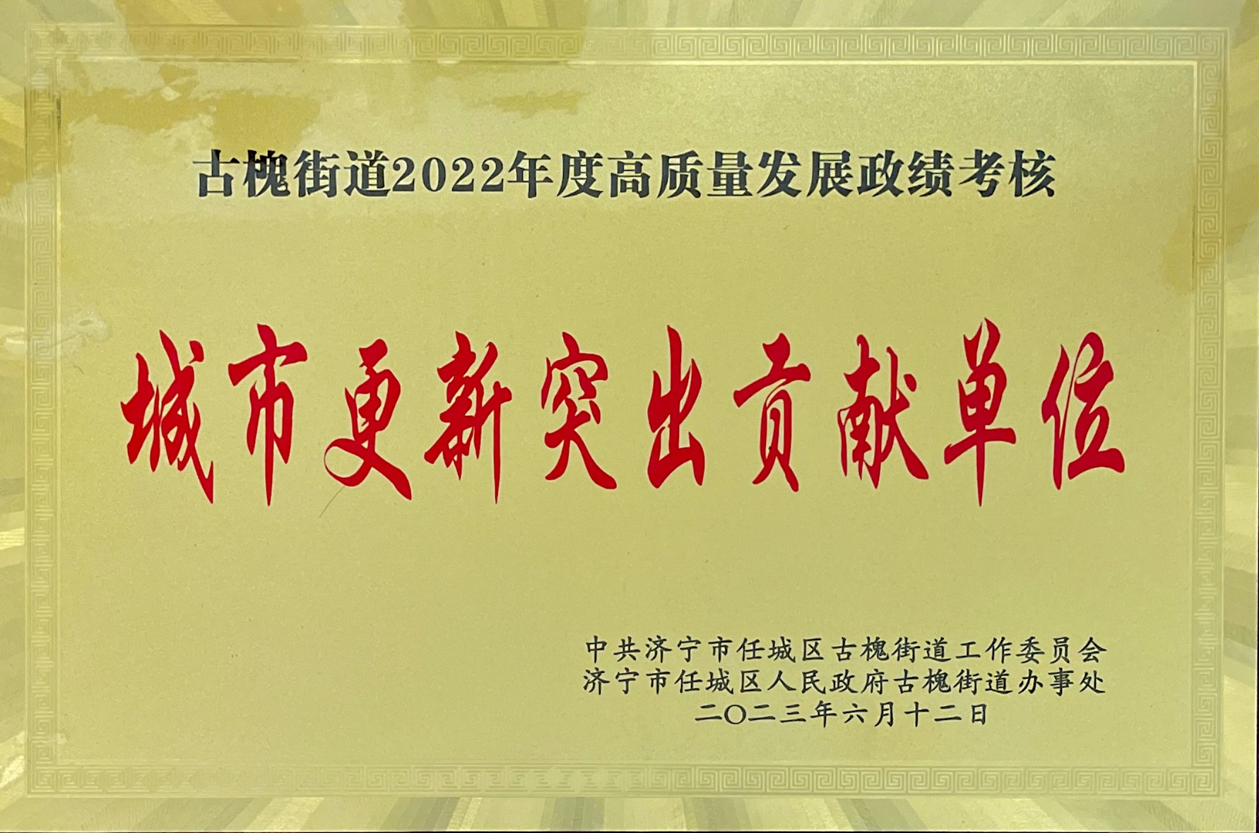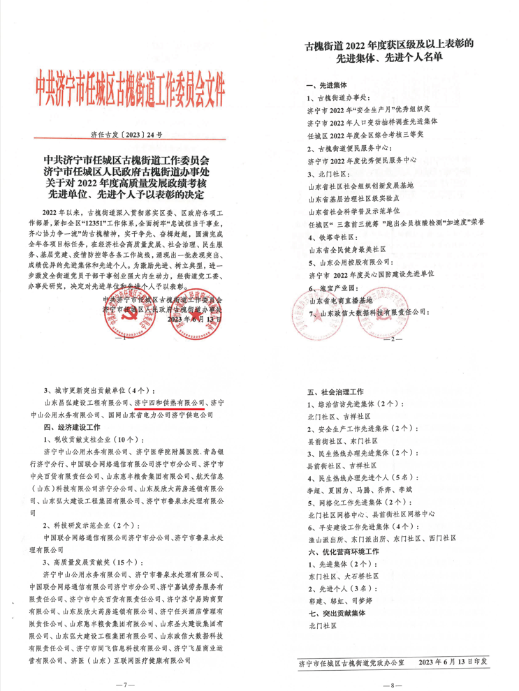 濟(jì)寧四和供熱有限公司榮獲古槐街道 2022年度“城市建設(shè)突出貢獻(xiàn)單位”表彰