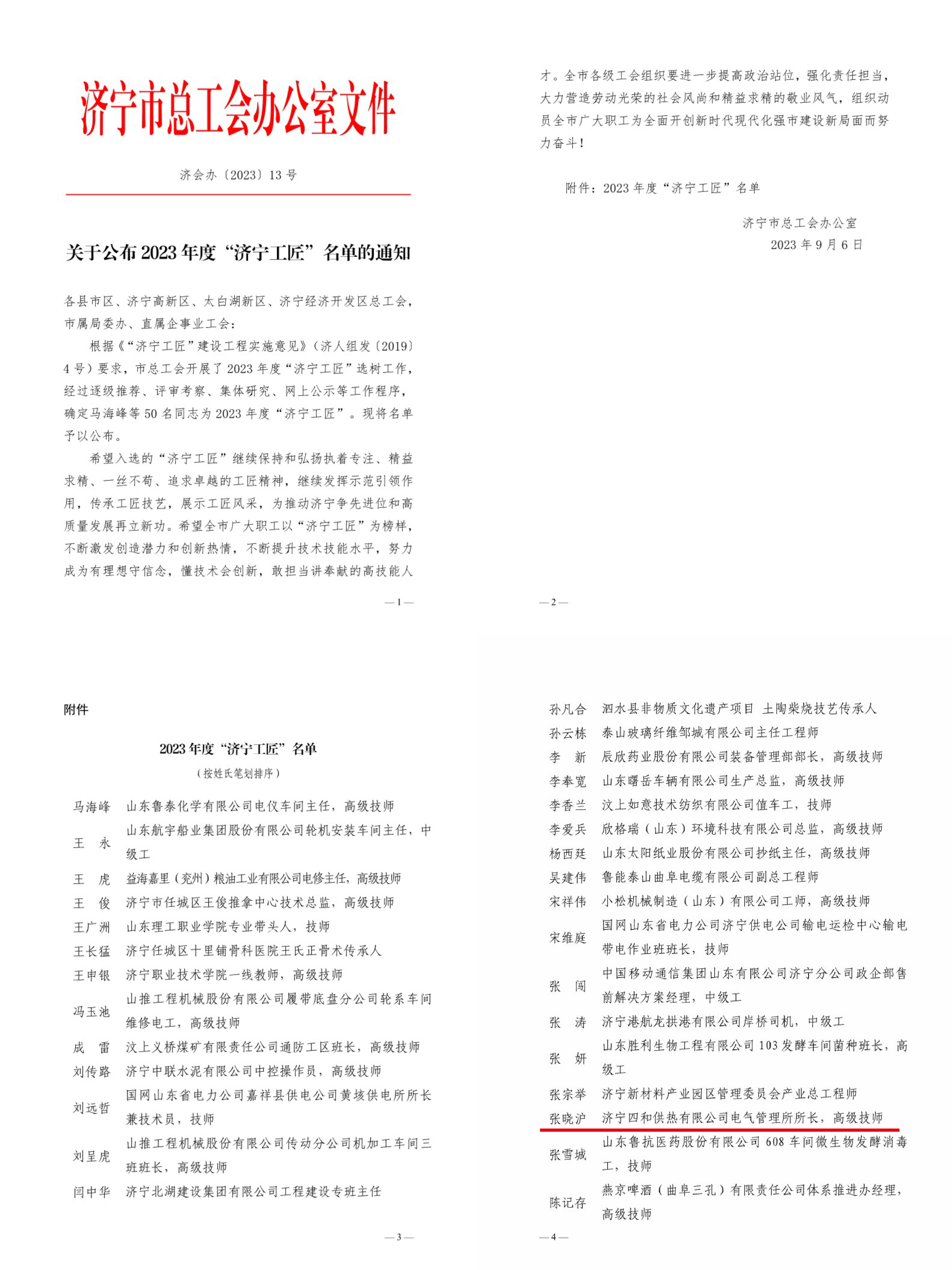 9月6日,濟(jì)寧市總工會(huì)辦公室印發(fā)了《關(guān)于公布2023年度“濟(jì)寧工匠”名單的通知》,濟(jì)寧四和供熱有限公司張曉滬同志名列其中,榮獲2023年度“濟(jì)寧工匠”榮譽(yù)稱號(hào)。