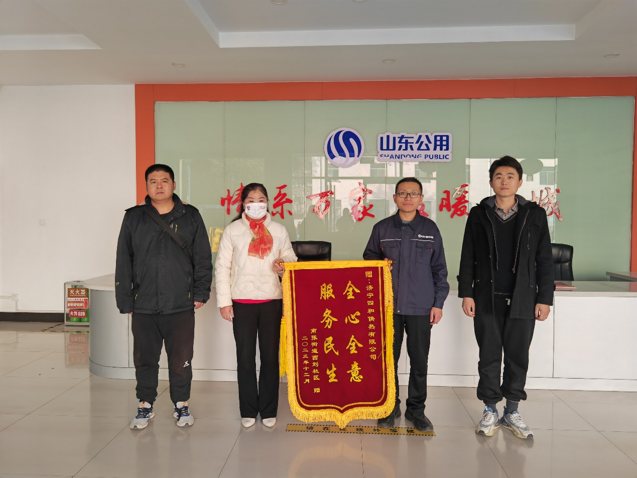 12月5日下午,南張街道西劉社區(qū)的負責人將一面印著“全心全意,服務民生”的錦旗送到了濟寧四和供熱公司,誠摯地對四和供熱公司的周到服務以及供熱六區(qū)網格員朱道新的認真負責表示感謝。